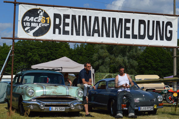 Der Name „Annual Rock‘n‘Race Festival“ traf auf das Race 61 auch in diesem Jahr uneingeschränkt zu. Trotz der bereits begonnenen Sommerferien in Berlin und Brandenburg, trotz hochsommerlicher Hitze, genossen zahlreiche unverdrossene die gelungene Mischung aus feierfreudiger Festivalstimmung, rasanten Autorennen mit liebevoll gepflegten und aufgebauten Oldtimern und dem Lebensgefühl vergangener Tage. Ganz egal, ob 30er Jahre Hot Rod, 40er Jahre Custom Car, 50er Flossenklassiker, 60er Jahre Muscle Car oder 70er Jahre Dickschiff – bei diesem überregional bekannten US Car-Treffen in der Schorfheide war ein jeder gern gesehen. Mit oder ohne Auto, Motorrad, Truck, Van oder Wohnmobil – der Spaß stand im Vordergrund.