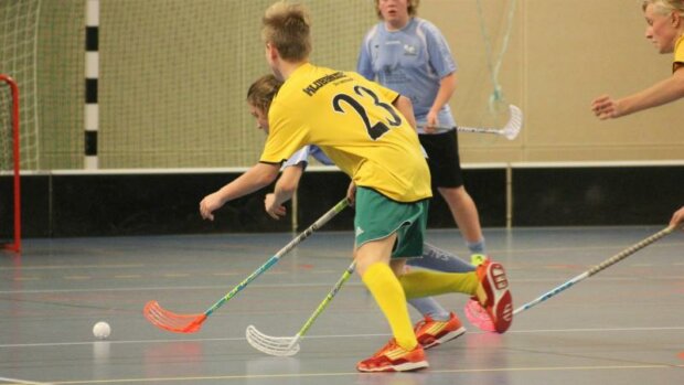 Floorball ist auch unter der früheren Bezeichnung Unihockey bekannt. Es ist ein mit Hockey vergleichbarer Hallen-Mannschaftssport, der in den 1970er-Jahren entwickelt wurde. Besonderheit beim Floorball ist, dass das Spielfeld durch eine Bande begrenzt ist und auch hinter den Toren weitergespielt wird. Das Großfeld misst 40 mal 20 Meter, das Kleinfeld 24 mal 14 Meter. Es gibt also in diesem Sinne kein „Aus“. Floorball oder Unihockey ist weit verbreitet in Schweden, Finnland und Schweiz. Es gibt Bestrebungen Floorball in das olympische Programm 2020 aufzunehmen. Der weiße Unihockeyball besteht aus Kunststoff und ist mit nur 23 Gramm sehr leicht. Zahlreiche kleine Dellen (Dimples) in der Oberfläche machen ihn aerodynamisch. Der Durchmesser beträgt 72 Millimeter, charakteristische sind die 26 Löcher. Auch der Unihockey-Schläger besteht aus Kunststoff und wiegt maximal 380 Gramm. Die Großfeld-Tore sind 115 Zentimeter hoch und 160 Zentimeter breit. Floorball wird mit fünf Feldspielern und einem Torwart gespielt. Die Regeln sind strenger als beim Eishockey, massiver Körpereinsatz ist verboten. Regel-Verstöße werden mit Zeitstrafen geahndet.
