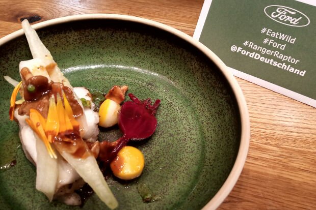 Hahn zeichnete sein Gericht sowohl durch grüne als auch reife Wacholderbeeren aus der Schwäbischen Alb aus, einer Gebirgskette im Südwesten Deutschlands. Den Ford Presselunch in der Berliner Speisekneipe Tisk, quasi die Kür vor einer Auswahl automobiljournalistischer Gourmands, läutete er mit einer Kürbis-Cremesuppe nebst Kräuteröl aus dem Tisk-eigenen Bauerngarten ein. Als Vorspeise folgte Tatar, Kalsbries, Mais und Steinpilze, geadelt durch Majoran, leicht bittere Lauchasche, Tomatenessig, Tagetes-Blüten und fermentierten Spargel. Wo bleiben die mit dem Ford Pickup, den Hahn ob seiner Offroad-Tugenden zu Recht gelobt hat, gesammelten Wacholderbeeren?